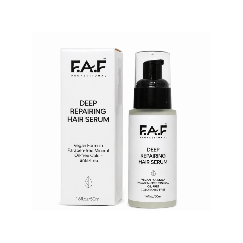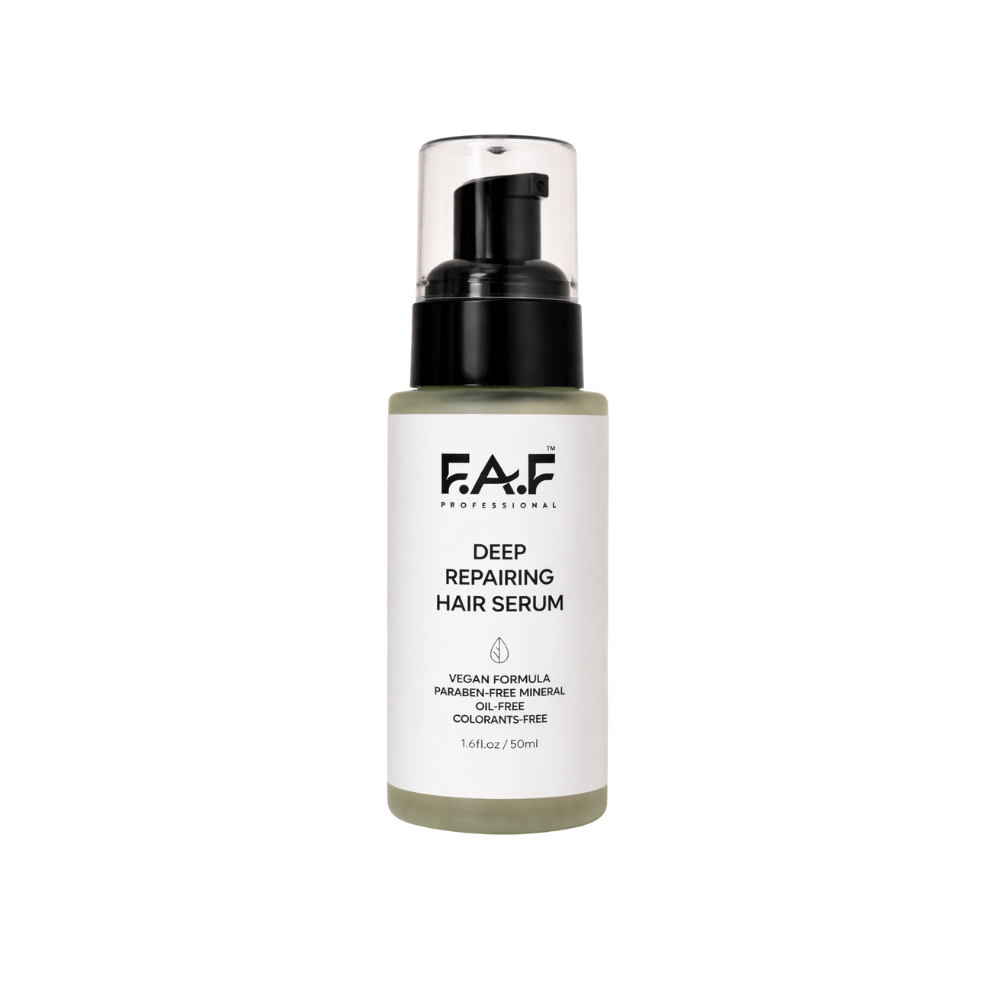 The F.A.F Professional Deep Repairing Hair Serum is a lightweight, fast-absorbing treatment designed to restore damaged, dull, and frizzy hair while maintaining natural volume. Its vegan, oil-free formula deeply penetrates the hair fiber to repair damage, enhance smoothness, and improve overall hair health without leaving residue.